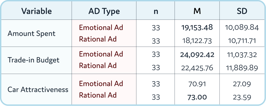 Even though participants exposed to the emotional advertisement spent slightly more on average ($19,153.48) and tended to allocate a higher trade-in budget, a one-way ANOVA revealed no statistically significant differences across ad conditions for any dependent variables (Amount Spent, Trade-in Budget, or Attractiveness). Amount Spent: F (1, 64) = 0.16, p = .689